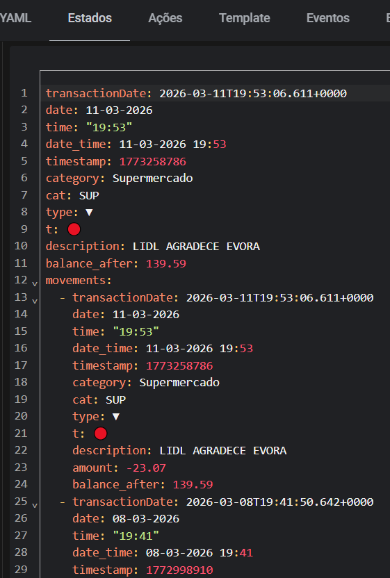 A minha cidade é pequena, e posso-me dar ao luxo de mapear os principais supermercados em zonas. Todos estão identificados com “Supermercado XXXXX”. Com isto consigo fazer algumas automações com o telemóvel, notificações e cartões condicionais, por exemplo para abrir automaticamente a lista de compras e mostrar-me o saldo que tenho em cada cartão, para saber qual utilizar. Agora já consigo ter isto. Além disso, posso também agora, coma minha integração, atualizar automaticamente o saldo Edenred 1 minuto depois de sair de um supermercado
